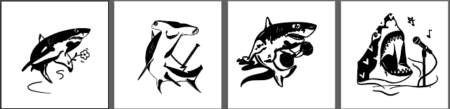 Colección de 4 ilustraciones vectoriales en blanco y negro, inspiradas en la potencia y el instinto del tiburón como símbolo de movimiento, deseo y supervivencia.